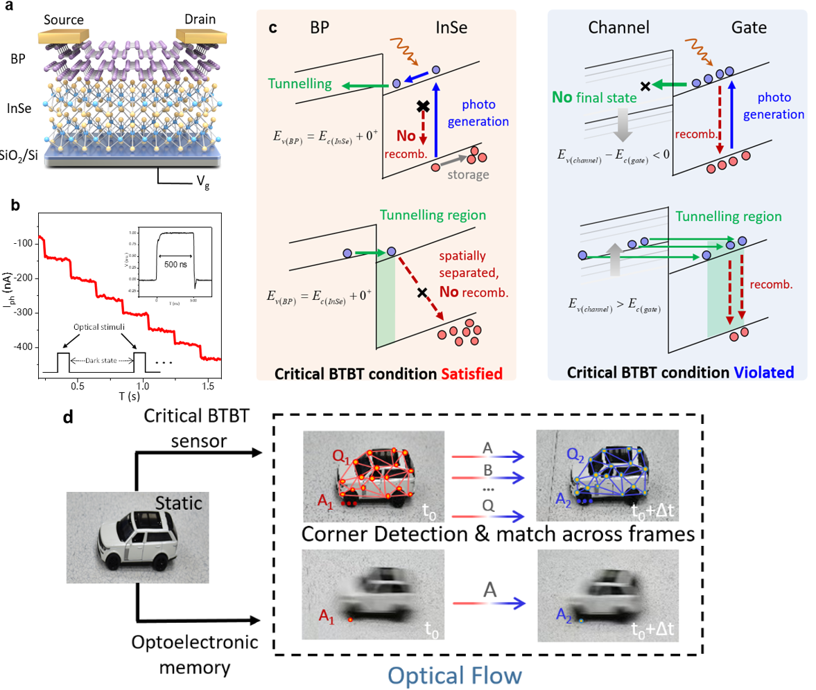 另一方面,研究團隊還聚焦于實現(xiàn)類視網(wǎng)膜高速紅外光電存儲與動目標(biāo)追蹤的協(xié)同集成。通過構(gòu)建BP/InSe二維范德華異質(zhì)結(jié)結(jié)構(gòu),發(fā)現(xiàn)了非平凡帶帶隧穿(critical band-to-band tunneling)效應(yīng),首次實現(xiàn)在520–980 nm寬譜范圍內(nèi)可見-近紅外的低能紅外光子隧穿與非易失性存儲。該機制顯著優(yōu)于傳統(tǒng)photogating或浮柵器件,在不犧牲響應(yīng)速度的前提下,抑制了拖尾與模糊現(xiàn)象,實現(xiàn)了500 ns級別的光存儲速度。