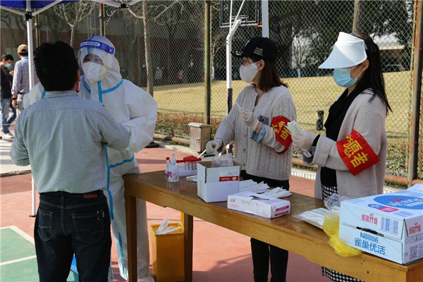 志愿者配合醫(yī)護(hù)人員進(jìn)行核酸檢測(cè)