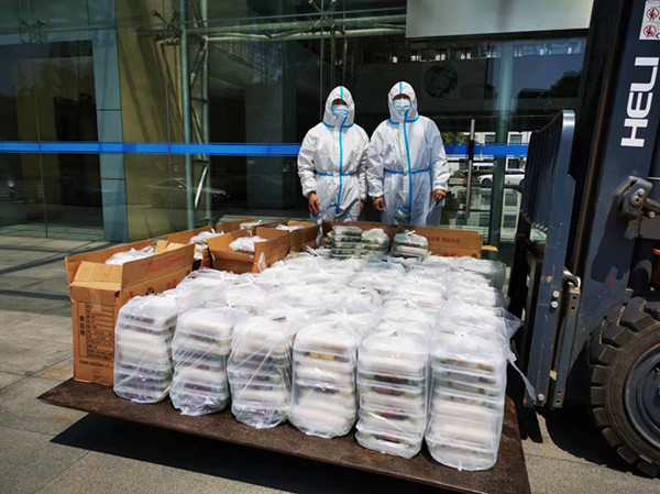 自4月6日虹口園區(qū)升級防控管理措施以來,在園人員保持相對靜止,志愿者隊在進一步優(yōu)化調(diào)整后,每天除了日常組織核酸及抗原檢測外,還扛起了園區(qū)全員每日三餐與生活物資的卸貨、搬運、分揀和發(fā)放的重任。每天不論清晨、正午、夜幕降臨,都時常看到志愿者們忙碌的身影,他們聚點成線,用自己的雙手為園區(qū)構(gòu)建起一條通暢的物資傳輸網(wǎng)絡(luò)。為減少抗疫物資的消耗,部分任務(wù)以人員最少化為原則,有時僅靠兩人就要完成全所各樓棟的餐飯分發(fā)工作。陽春四月,天氣漸熱,穿著密不透風的隔離服就像“蒸桑拿”一般,志愿者們不但毫無怨言,隊伍還日漸壯大起來,除年輕力壯的青年職工踴躍報名外,多名所領(lǐng)導(dǎo)、部門負責人、支部書記都積極參與其中,在特殊時期為共同防疫做一份貢獻。