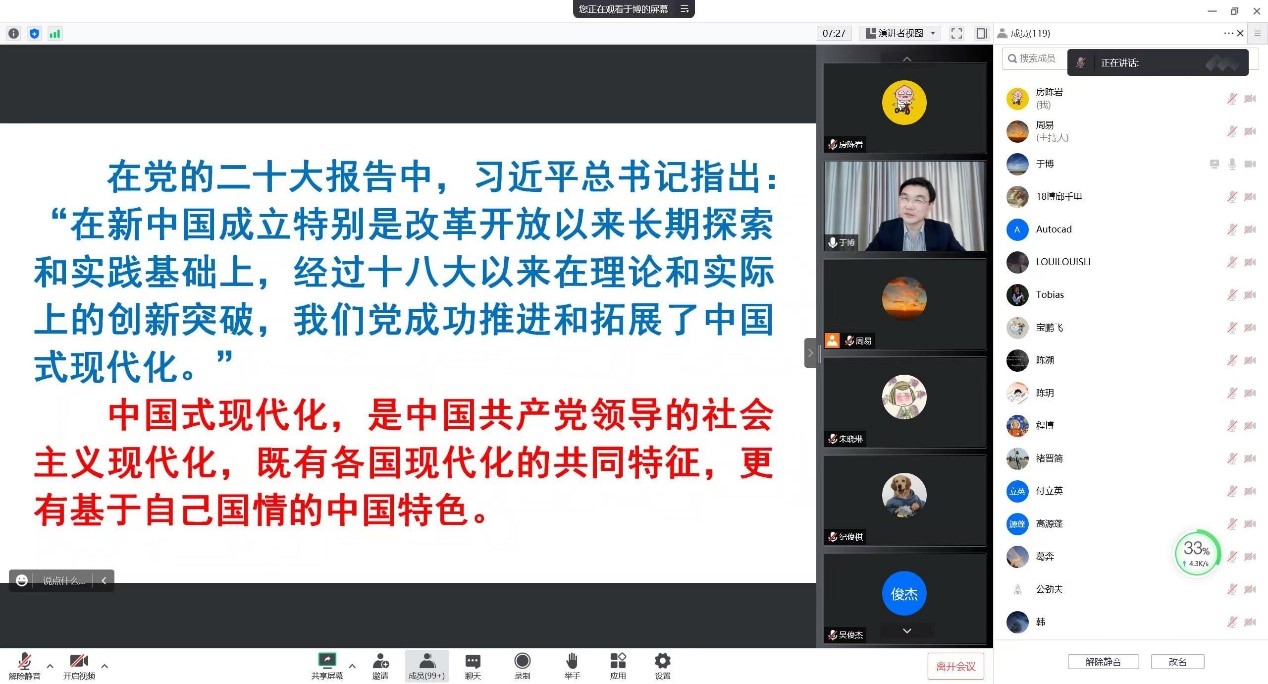 于博結合自身學習二十大報告的心得體會,以“深入學習貫徹黨的二十大精神,努力成為科技戰(zhàn)線的棟梁之才”作主題團課。他從“新時代征程的政治宣言與行動綱領”、“科技自立自強-中國式現(xiàn)代化的戰(zhàn)略支撐”以及“奮斗新征程、建功新時代,成為棟梁之材”三個方面帶領大家深入全面學習了二十大報告。激勵團員青年立志報國,從國家對科技自立自強的迫切需求出發(fā),以實際行動為科技強國做出貢獻。