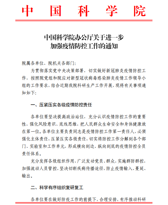 中國(guó)科學(xué)院辦公廳關(guān)于進(jìn)一步加強(qiáng)疫情防控工作的通知